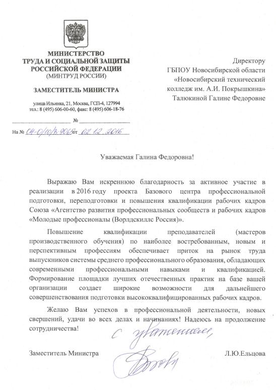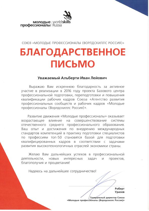 Альберти Иван Лейович - Благодарственное письмо Союза «Молодые профессионалы Ворлдскиллс России»