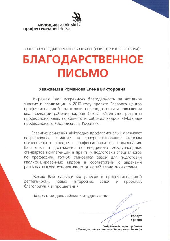 Романова Елена Викторовна - Благодарственное письмо Союза «Молодые профессионалы Ворлдскиллс России»