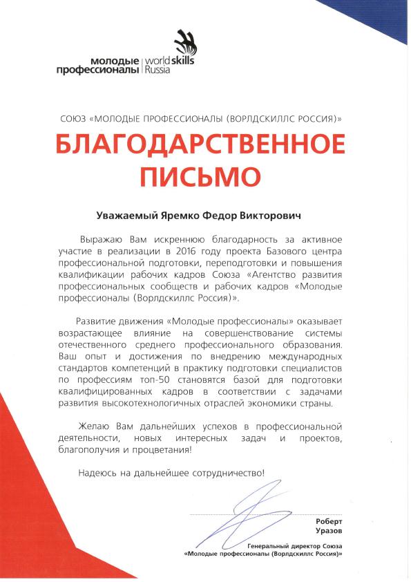 Яремко Федор Викторович - Благодарственное письмо Союза «Молодые профессионалы Ворлдскиллс России»