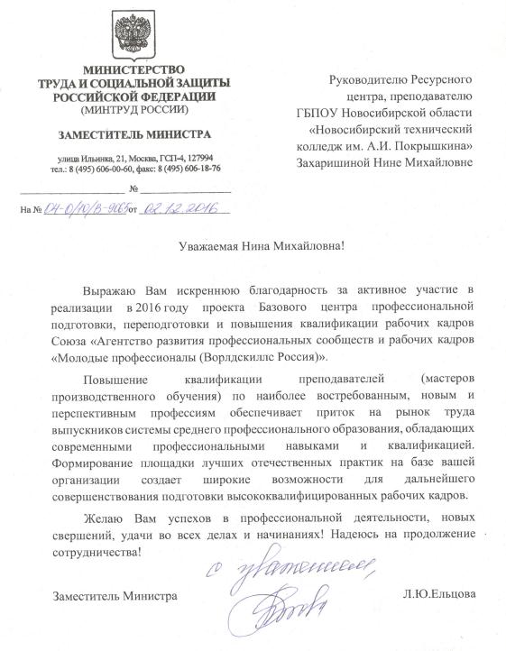 Нина Михайловна Захаришина - Благодарственное письмо Министерства труда защиты Российской Федерации.