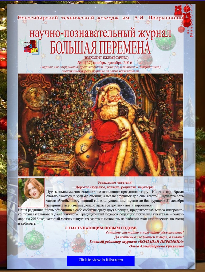 Меньше месяца отделяет нас от главного праздника в году – Нового года! И мы спешим порадовать своих любимых читателей предпраздничным выпуском журнала «БП». Предновогоднее поздравление директора колледжа Галины Федоровны Талюкиной, поздравления студентов, два интересных эксклюзивных интервью с нашими студентами, история о том, откуда появились в России Дед Мороз и Снегурочка – без которых теперь мы не мыслим себе приход Нового года… Это далеко не вся информация, которую мы предлагаем вам в этом выпуске. А еще вы сможете узнать, как изучают студенты технический английский язык, какие рекомендации психолога будут полезны в разных жизненных ситуациях, как приготовиться самостоятельно к зачету, сессии, просто уроку. И, конечно, вас ждет традиционный подарок редакции любимым читателям – календарь на 2016 год, который можно распечатать и положить на рабочий стол или повесить на стенд в кабинете.