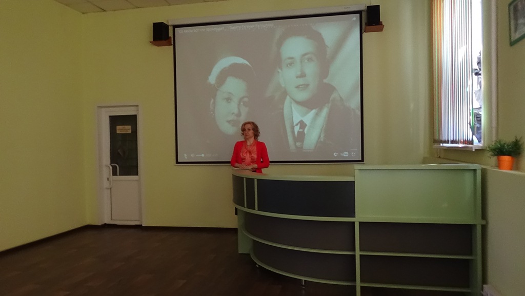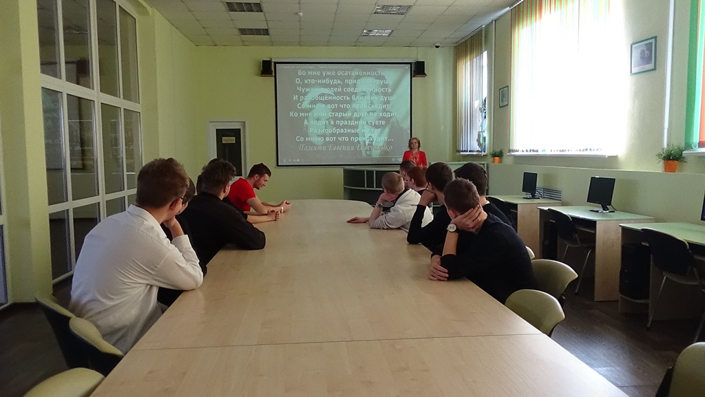 Анцыферова Т.Ю. рассказала биографию поэта. Студенты посмотрели видеоролик: «Со мною вот что происходит…», фрагмент фильма «Застава Ильича» (выступление Е. Евтушенко в Политехническом институте), вспомнили и прослушали песни на стихи Евтушенко. Поэзию Евгения Евтушенко ценят и любят, без преувеличения, в сотнях стран, но знают его, прежде всего как русского, российского поэта. Евгений Александрович побывал во всех уголках бывшего Советского Союза и в 93 странах мира, свободно общался на нескольких языках, но свои мысли и чувства доверял именно русскому языку. Никогда не забывал о своей малой Родине – «Откуда родом я? Я с некой сибирской станции Зима…». Гордился тем, что он «сибирской породы», и, описывая простых людей российской глубинки, отмечал: «…они навеки для меня и есть все вместе – Родина».