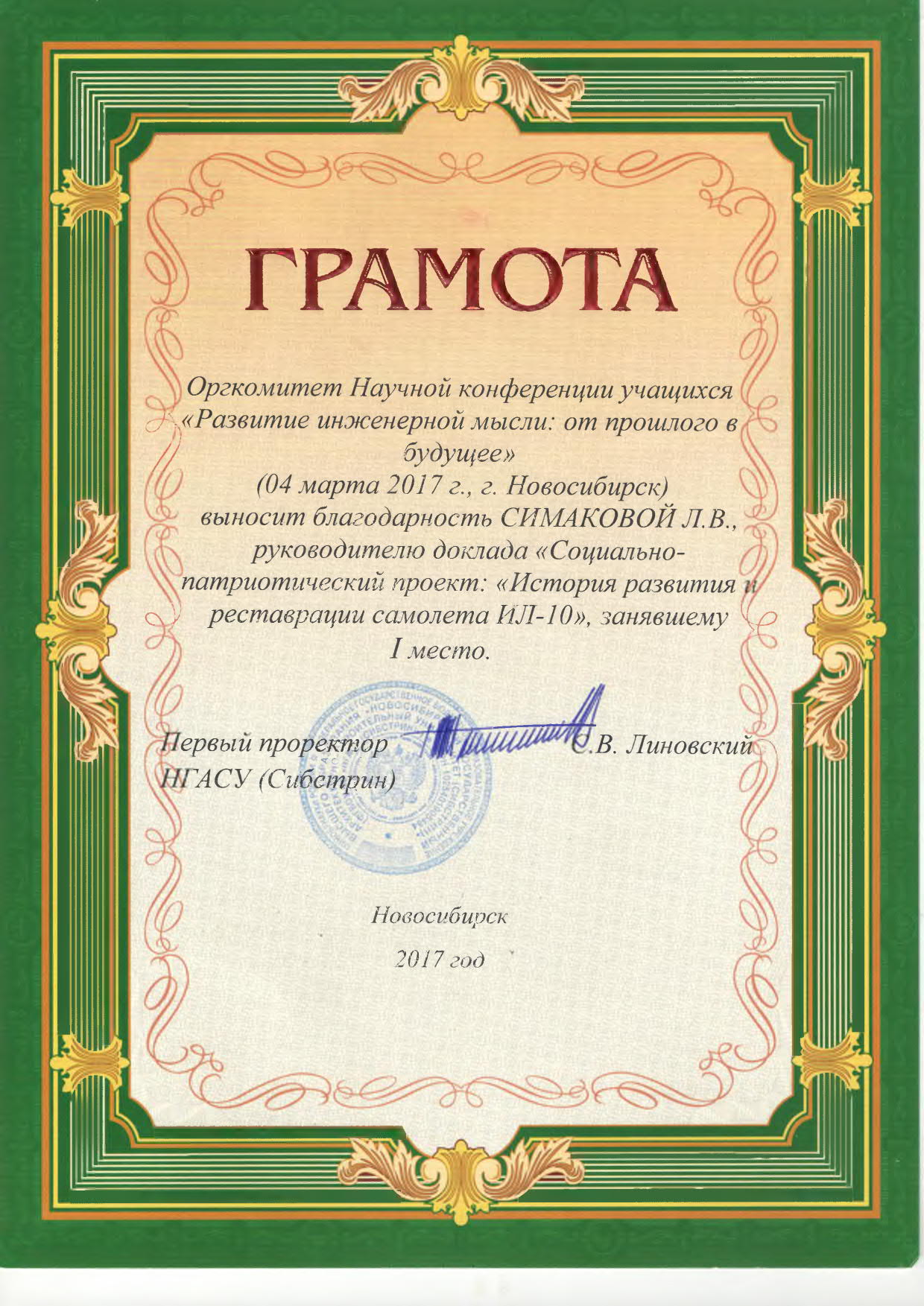 В секции «История инженерно-технической мысли: этапы развития, тенденции» студент нашего колледжа Боярчук Артем выступал с докладом «Социально-патриотический проект: «История развития и реставрации самолёта ИЛ-10» (научный руководитель Симакова Л.В.) где занял первое место! Победители и призеры получают дополнительно 10 баллов соответственно при зачислении в НГАСУ (Сибстрин) согласно Правилам приема НГАСУ (Сибстрин).