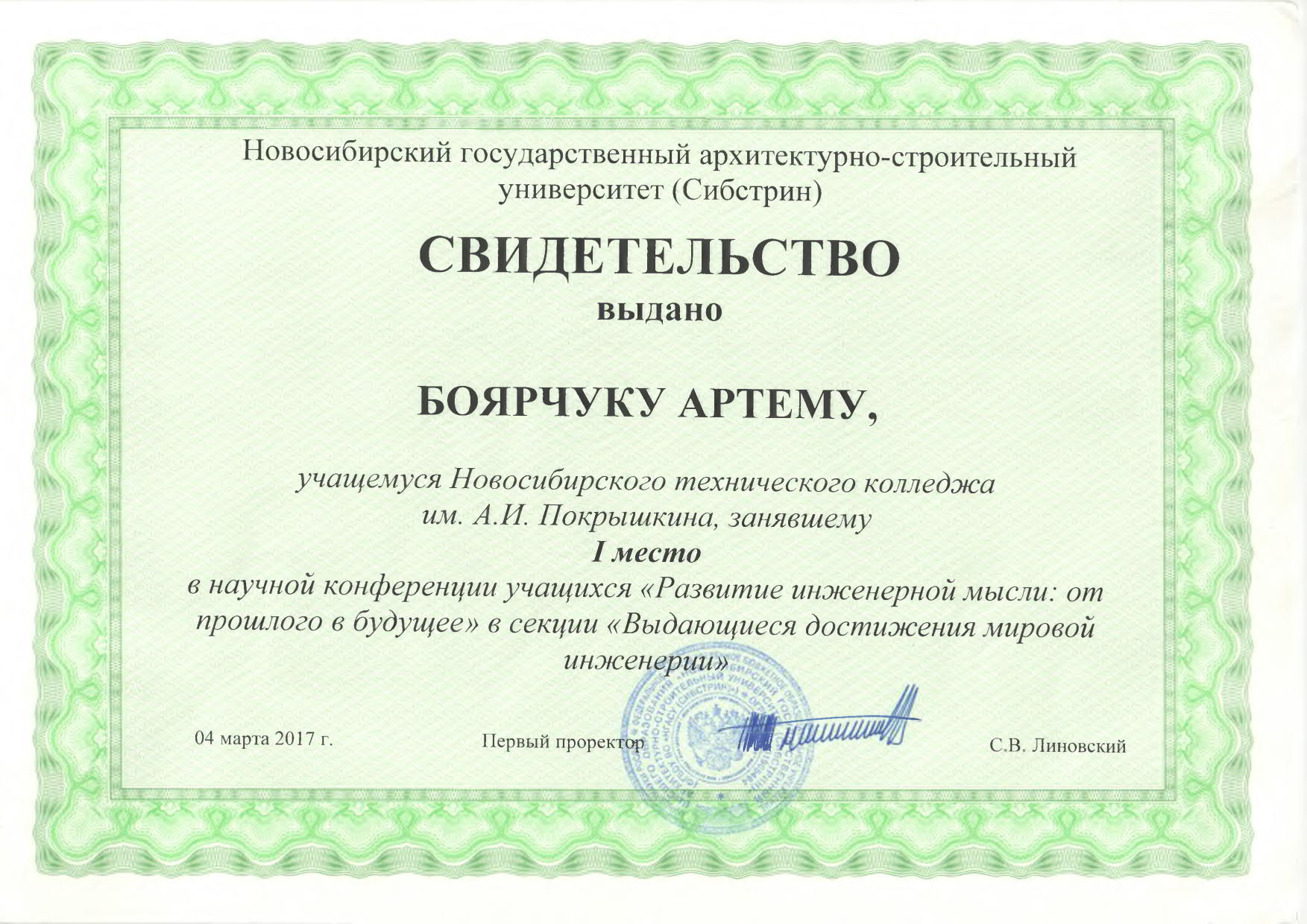 Первого апреля состоялось награждение студентов, принимавших участие в четвертой научной конференции «Развитие инженерной мысли: от прошлого в будущее» в секции «История инженерно-технической мысли: этапы развития, тенденции» на базе НГАСУ (Сибстрин).