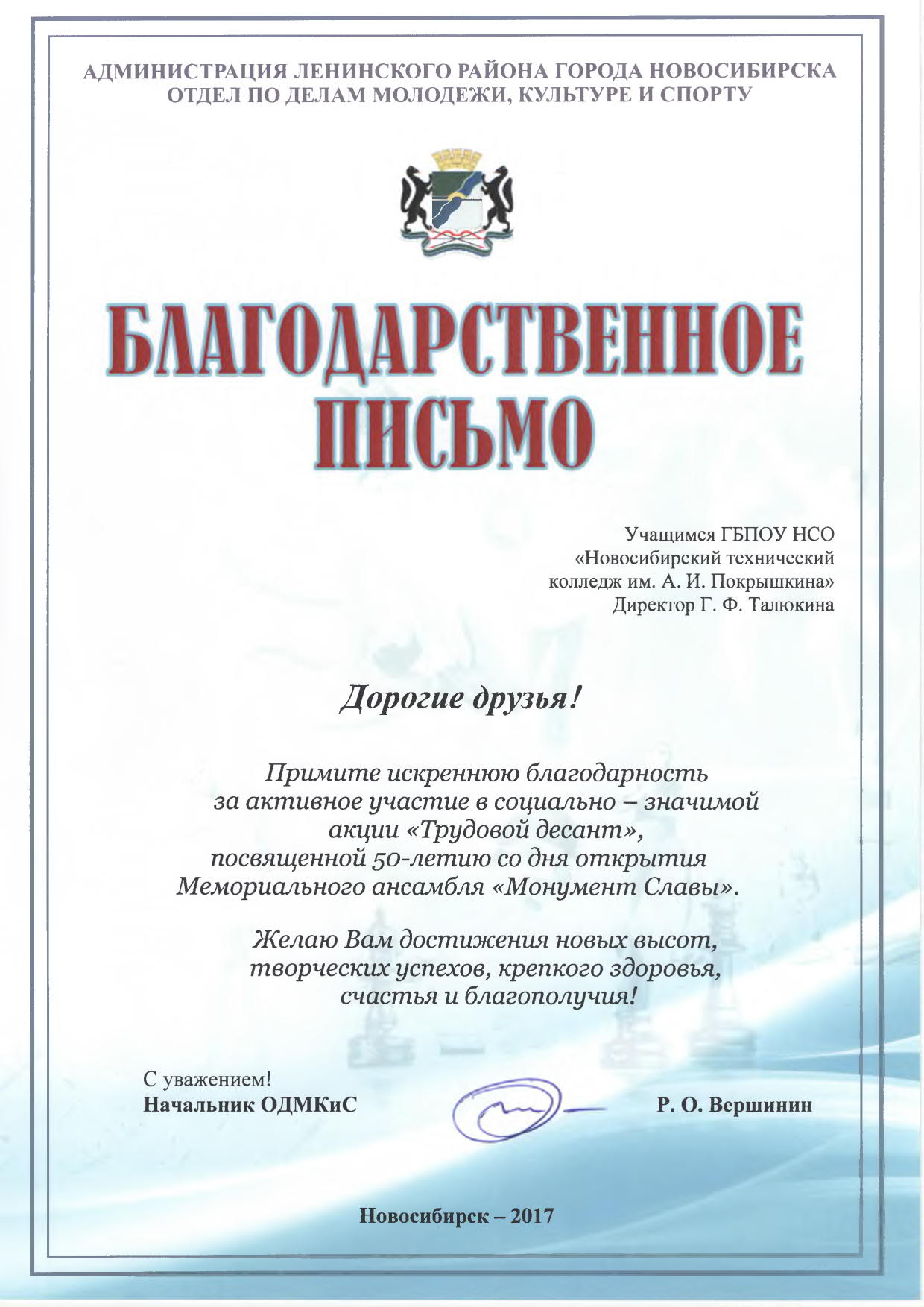 Студенты помогли навести порядок на территории Монумента славы, приняли участие в квест-игре на знание территории Монумента славы. После всех мероприятий прошло торжественного построение, на котором ребят поблагодарили за работу, вручили Благодарственное письмо администрации Ленинского района и пригласили на чаепитие.