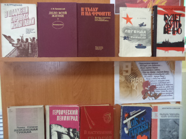 В экспозиции представлены книги, рассказывающие о героизме, мужестве и стойкости советских людей в годы Великой Отечественной войны. Произведения повествуют об уникальных человеческих судьбах, неизвестных или малоизвестных военных событиях, интернациональном характере подвигов, совершавшихся во имя Победы. Вашему вниманию так же предложены очерки и воспоминания военачальников, солдат и партизан, хроника военных лет. Представлены и книги и с художественными произведениями о войне писателей и поэтов Бориса Васильева, Василя Быкова, Юрия Бондарева, Булата Окуджавы, Юлии Друниной. Главный смысл произведений – священная память о тех, кто завоевал право на бессмертие самой дорогой ценой – ценой жизни.