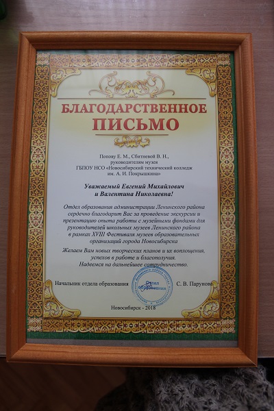 18 мая 2018 года в колледже им. А. И. Покрышкина действительно получилось днем музея! Утром - совещание руководителей музеев в мэрии г. Новосибирска, на котором утром побывал Евгений Михайлович Попов, а уже в 13.00 вместе с Валентиной Николаевной и Еленой Владимировной Степановой, зам.директора по УВР, они проводили методическое совещание, учебу, дружескую и профессиональную встречу руководителей музеев Ленинского района. В рамках встречи руководители музеев посетили библиотеку, рассмотрели профессиональные вопросы, посетили музей, узнали об особенностях хранения и учета музейных ценностей. А сотрудники нашего музея были награждены Благодарственным письмом отдела образования Ленинского района.