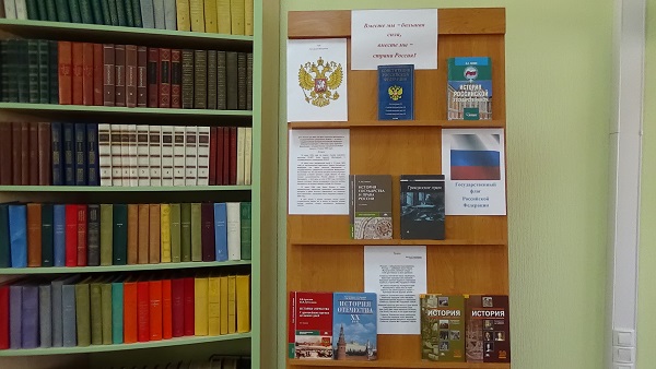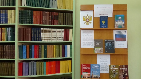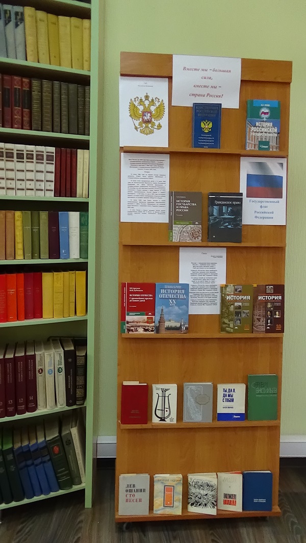 В читальном зале библиотеки колледжа оформлена книжно-иллюстративная выставка «Вместе мы – большая сила, вместе мы – страна Россия!», где представлены материалы об истории возникновения праздника, Герб России, Флаг России, Гимн России, а так же Конституция РФ, учебники по истории нашей страны, государства и права. На выставке Вы можете познакомиться с лирикой советских и российских поэтов, прославляющих нашу великую державу.