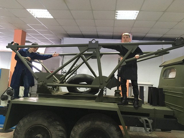 Весной прошлого года на окраине Новосибирска был найден старый заброшенный автомобиль ЗИЛ-157. Этот автомобиль оказался как нельзя, кстати, для установки БМ-13. Его привезли в колледж, и работа над восстановлением «Катюши»началась. Если автомобиль надо было только отремонтировать, то боевую установку пришлось делать, как говорится «с нуля», а для этого нужны были чертежи, схемы, описания. Поисковой группе пришлось много поработать, чтобы найти нужные документы. В настоящее время «Катюша» практически полностью восстановлена и ждет своего времени, когда в канун Дня Победы ее установят в нашем мемориально-историческом парке «Патриот» и она станет еще одним экспонатом парка.