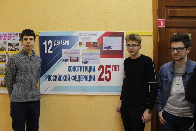 В Новосибирском техническом колледже им. А.И.Покрышкина прошли мероприятия, посвященные 25-летию Конституции Российской Федерации. Цель мероприятий: формирование у студентов понимания сущности и значения Конституции и государственных символов Российской Федерации; воспитание чувства уважения, гордости, патриотизма, расширение кругозора и повышение общей культуры студентов. В студенческих группах прошли классные часы, посвященные Дню Конституции, студенты второго курса приняли участие в викторине, посвященной 25-летию Конституции РФ. В актовом зале колледжа прошла торжественная линейка, посвященная Основному закону нашего государства. И даже Областную предметную олимпиаду по предмету «Материаловедение», которая проходила в нашем колледже, организаторы посвятили 25-летию Конституции Российской Федерации.