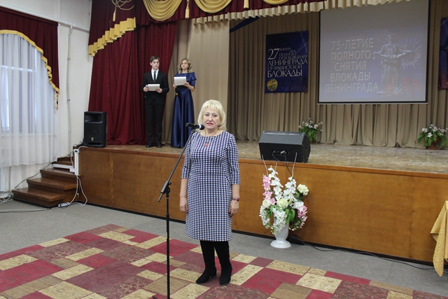 В начале встречи перед собравшимися выступила Ольга Алексеевна Сперанская, консультант управления профессионального образования и подготовки трудовых ресурсов министерства образования Новосибирской области. Она поздравила всех собравшихся в зале с великой датой –75-ой годовщиной полного освобождения Ленинграда от фашистской блокады, пожелала всем ветеранам и блокадникам здоровья, а студентам – достойно продолжать дела, основы которых были заложены нынешними ветеранами - беречь Родину, любить свою профессию, помнить тот подвиг, который совершили советские люди в годы Великой Отечественной войны.
