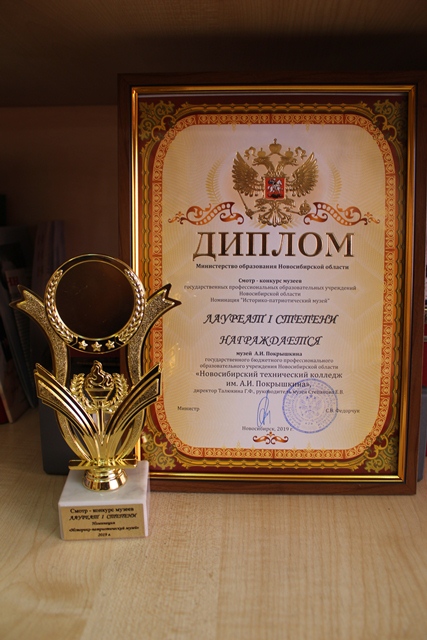 В этом году музей А.И. Покрышкина в очередной раз стал Лауреатом I степени смотра - конкурса музеев государственных профессиональных образовательных учреждений Новосибирской области в номинации «Историко-патриотический музей». 21 год назад в Новосибирском техническом колледже им. А.И. Покрышкина был открыт музей прославленного летчика, с тех пор он стал известен не только в Новосибирске и Новосибирской области, но и за ее пределами. В этом году в музее идет большая работа по подготовке к празднованию 75-летия Победы в Великой Отечественной войне. Совет музея планирует открыть в залах музея две новых экспозиции: «Летчики – новосибирцы Герои Советского Союза» и «Герои Безымянной высоты». Студенты колледжа – члены поисково-исторического клуба «Память» уже насколько лет собирают материалы для этих экспозиций. В рамках проекта «Мы именем его гордимся!» идет подготовка экскурсоводов для музея из числа студентов. Ребята будут проводить экскурсии для школьников, студентов колледжей и ВУЗов, ветеранов, военнослужащих.