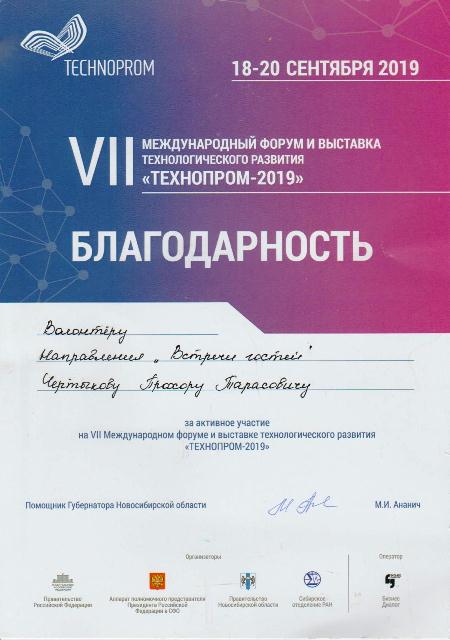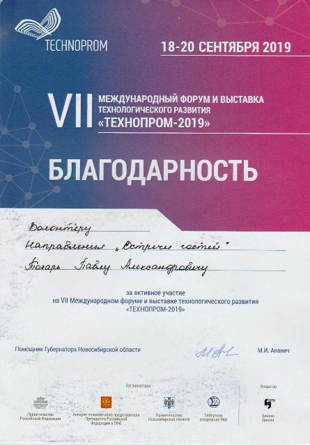 С 18 по 20 сентября 2019 года в Новосибирске проходил VII Международный форум технологического развития «Технопром». Наши студенты: Токарь Павел и Чертыков Прохор (группа МР-232) по итогам конкурсного отбора Региональным ресурсным центром добровольчества «Волонтёрский корпус Новосибирской области» вошли в число 66 студентов-добровольцев.