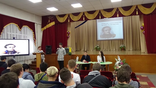 15 октября в актовом зале колледжа под руководством преподавателя Екатерины Геннадьевны Акулич прошел литературно-музыкальный час «Поэты не рождаются случайно…», посвященный 205-летию со дня рождения Михаила Юрьевича Лермонтова.