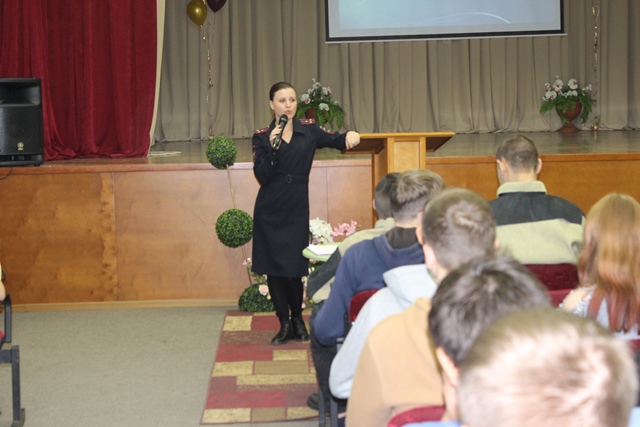 29 октября в актовом зале Новосибирского технического колледжа им. А.И.Покрышкина состоялась встреча студентов 1 курса с инспектором ОДН ЛО МВД России на ст. Новосибирск, старшим лейтенантом Мариной Владимировной Герлиц.