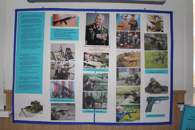 Готовясь к юбилею прославленного конструктора, члены Совета музея А.И.Покрышкина вместе с руководителем музея Сбитневой Валентиной Николаевной собрали материал о его жизни и деятельности и оформили в музее стенд и выставку литературы. В ноябре все гости нашего музея смогут познакомиться с биографией М.Т.Калашникова и отдать дань памяти этому величайшему конструктору стрелкового оружия.
