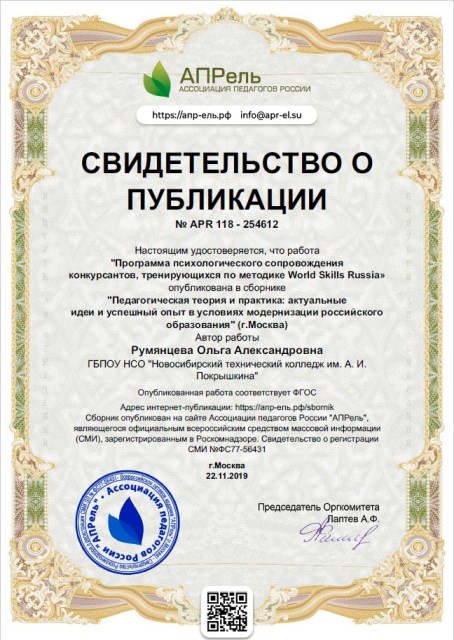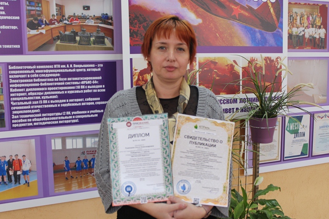 Поздравляем психолога колледжа Румянцеву Ольгу Александровну, победителя IX Всероссийского педагогического конкурса «МАСТЕРСКАЯ ПЕДАГОГА» в номинации «Авторские программы». Для участия в конкурсе была представлена авторская работа «Программа психологического сопровождения конкурсантов, тренирующихся по методике WorldSkills Russia». Данная работа, по заключению жюри конкурса, соответствует требованиям ФГОС, прошла экспертизу и получила высокую оценку экспертной группы. Работа опубликована в сборнике «Педагогическая теория и практика: актуальные идеи и успешный опыт в условиях модернизации российского образования» (г. Москва).