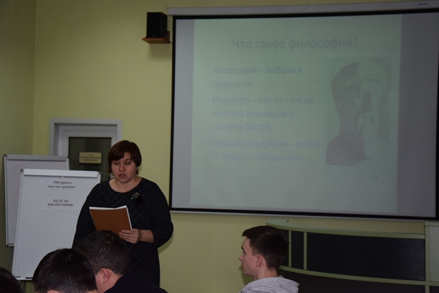 Неделя философии проводится с целью - показать и научить студентов критически воспринимать тот мир, в котором мы живем, понимать, как формируются те понятия, которые мы используем в науке, политике или повседневной жизни. Тема недели - «О чем спорят философы сегодня?» В библиотеке колледжа Елена Анатольевна Мазная подготовила иллюстративно-книжную выставку «Мудрость мысли храним... Философия» и провела тематический час «Философия на все времена», посвященный основам философских знаний.