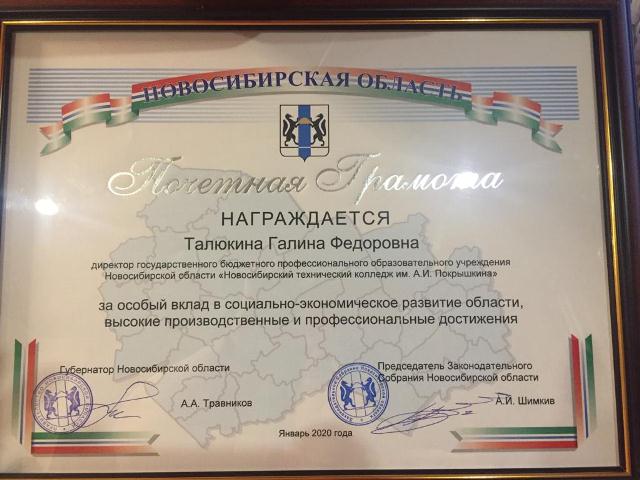 27 февраля в ГКЗ им. А. М. Каца на форуме «Социально-экономическое партнерство-2020 «Национальные проекты – платформа Сибирского лидерства» губернатор Новосибирской области Андрей Александрович Травников вручил Галине Федоровне Талюкиной, директору Новосибирского технического колледжа им. А.И.Покрышкина, Почетную грамоту Новосибирской области за особый вклад в социально-экономическое развитие области и высокие производственные и профессиональные достижения. В своем ответном слове Галина Федоровна сказала, что эта награда является высокой оценкой работы всего коллектива колледжа, которым она руководит.