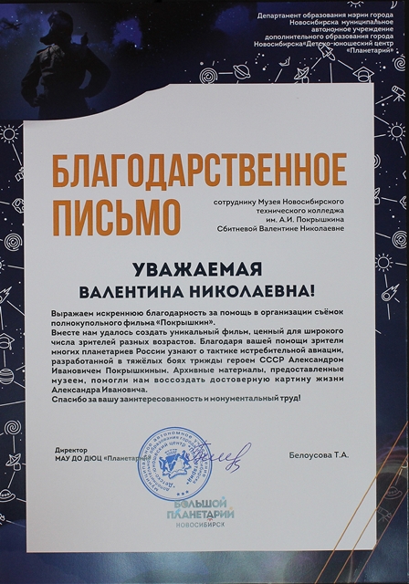 В результате работы в музее авторам удалось создать уникальный фильм, который будет транслироваться в различных планетариях нашей страны для аудитории различного возраста. Во время создания фильма были использованы архивные материалы музея, с помощью которых стало возможным восстановить полную объективную картину жизни нашего земляка – выпускника нашего учебного заведения, Александра Ивановича Покрышкина. Валентина Николаевна Сбитнева – руководитель музея и экскурсовод, оказала всестороннюю помощь в создании фильма, предоставила всю необходимую информацию и консультирование сотрудников планетария.
