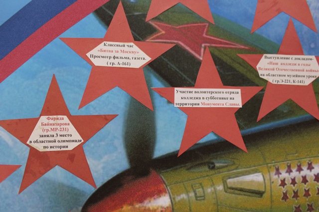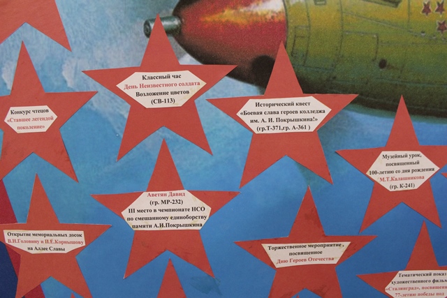 «Наши звезды Юбилею Победы посвящаем!» - так назвали ребята свой плакат. В рамках Года памяти и славы в колледже прошло очень много мероприятий. В музее А.И.Покрышкина весь год проходили экскурсии, музейные уроки, встречи с ветеранами. В студенческих группах проходили классные часы: «Сибиряки – герои Безымянной высоты», «Из одного металла льют, медаль за бой, медаль за труд!», «Наш колледж в годы Великой Отечественной войны», «Летчики – Герои Советского Союза – земляки А.И.Покрышкина», «Подвиг М.П.Девятаева. Побег из ада», «Ахтунг! Ахтунг! В небе Покрышкин» и другие. В библиотеке колледжа весь год шел лекторий «Кинохроника Великой Отечественной войны», где студенты могли посмотреть документальные фильмы, снятые военными кинооператорами: «Великая Отечественная война 1941-1945 гг.», «По обе стороны Победы», «Обыкновенный фашизм», «Великая война», «Легенды армии. А.И.Покрышкин». В колледже прошли такие значимые патриотические мероприятия, как «Неделя истории, посвященная 75-летию Великой Победы», областная научно-практическая конференция «Покрышкинские чтения», выставка «Великие граждане России», военно-спортивная игра «А ну-ка, парни!». В течение всего учебного года наш Клуб реставрации военной техники работал над восстановлением самолета времен Великой Отечественной войны И-16, а в мастерских колледжа проходила работа по созданию стелы «Журавли», посвященной сибирякам, погибшим на фронтах Великой Отечественной войны. И хотя в преддверии праздника все оказались на самоизоляции, праздничные и патриотические мероприятия, посвященные Юбилею Великой Победы, продолжились!