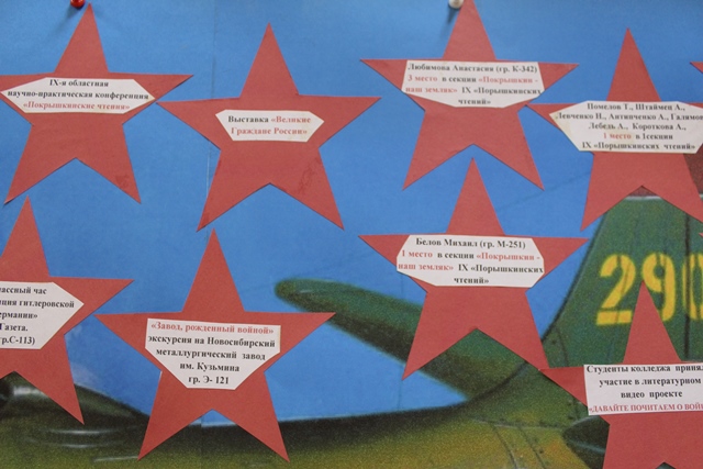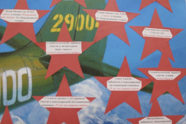 В начале учебного года студенческий совет колледжа, планируя свою работу, конечно же, большое значение уделил мероприятиям, посвященным 75-летию Победы в Великой Отечественной войне. Именно тогда возникла идея - все мероприятия и студенческие победы отмечать звездочками на плакате с изображением самолета А.И.Покрышкина. И вот спустя почти год 75 звездочек украсили плакат с изображением самолета А.И.Покрышкина. На каждой звездочке можно прочитать о достижениях студентов Новосибирского технического колледжа им. А.И.Покрышкина.