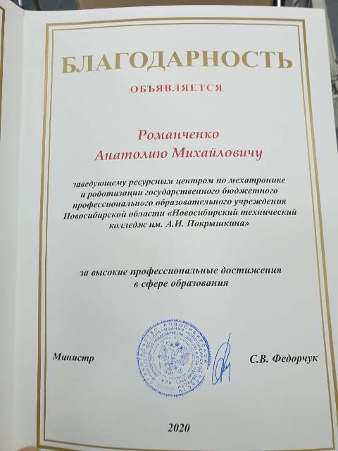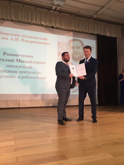 На мероприятии прошло торжественное награждение работников профессиональных образовательных учреждений Новосибирской области. Среди награжденных за высокие профессиональные достижения в области образования были работники Новосибирского технического колледжа им. А.И.Покрышкина: Романченко Анатолий Михайлович, заведующий ресурсным центром по мехатронике и роботизации и Тинина Алиса Олеговна, заведующая учебной частью нашего колледжа, им были вручены благодарственные письма министра образования Новосибирской области.