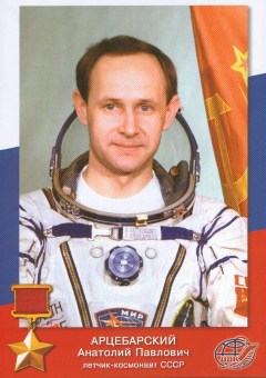 Анатолий Павлович Арцебарский — лётчик-космонавт СССР, 71-й космонавт СССР, лётчик-испытатель, Герой Советского Союза, общественный и научный деятель Российской Федерации. Совершил длительный космический полёт с 18 мая по 10 октября 1991 в качестве командира экипажа транспортного корабля «Союз ТМ-12» и ОК «Мир» по программе 9-й основной экспедиции (ЭО-9) и программы «Джуно» (Juno). В стартовый экипаж входили С. К. Крикалёв и Х. П. Шарман. Стал 248-м человеком в космосе, 71-м из СССРПерсональный позывной «Озон-1».За период космического полёта совершил шесть выходов в открытое космическое пространство. Передал смену на ОК «Мир» командиру 10-й основной экспедиции (ЭО-10) А. А. Волкову, возвратился на землю на «Союз ТМ-12» совместно с членами 8-й экспедиции посещения (ЭП-8) Т. О. Аубакировым (СССР) и Ф .А. Фибёком (Австрия). Продолжительность полёта 144 суток 15 часов 21 минута 50 секунд. Продолжительность работы в открытом космосе 32 часа 17 минут.