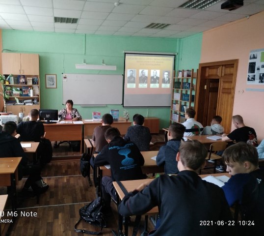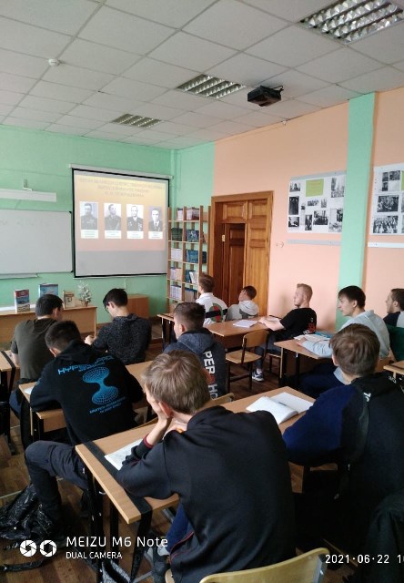 В группе С-211 преподаватель истории Елена Анатольевна Мазная провела урок памяти «Да разве сердце позабудет…22 июня 1941 года». Студенты познакомились с презентацией «Герои-выпускники» и посмотрели видео «Однополчане А. И. Покрышкина».