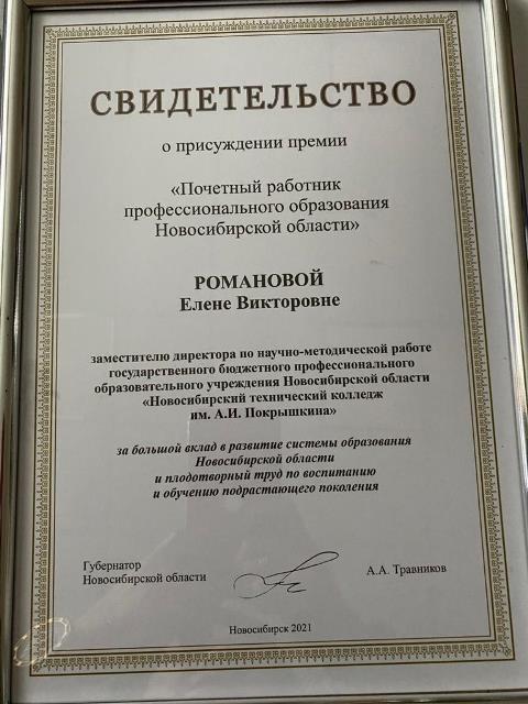 5 октября 2021 года, в рамках праздничной церемонии, посвящённой Дню Учителя, Андрей Александрович Травников – губернатор Новосибирской области, вручил свидетельства победителям федерального конкурса на присуждение премий лучшим учителям за достижения в педагогической деятельности, наградил победителей областного конкурса на присуждение премии «Почётный работник профобразования Новосибирской области».