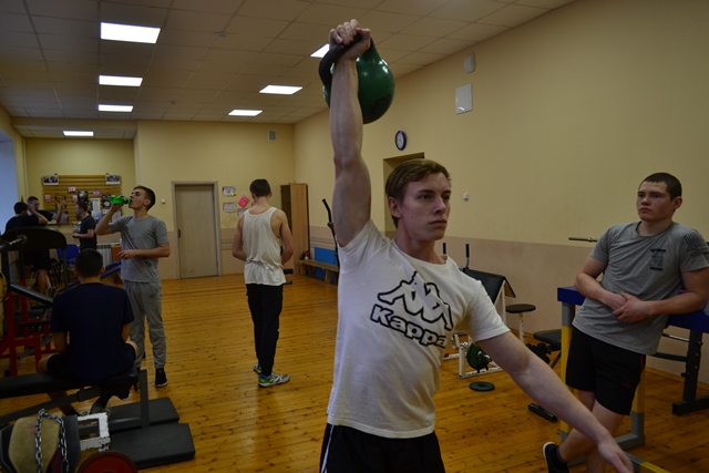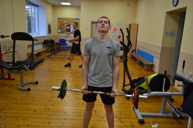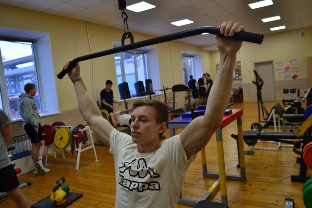 Два студента колледжа, волонтеры спортивного сообщества «Олимпия» по программе, разработанной Иваном Александровичем Никитиным (преподаватель физической культуры), демонстрируют крепкие мышцы, подтянутое тело, мускулистые руки.