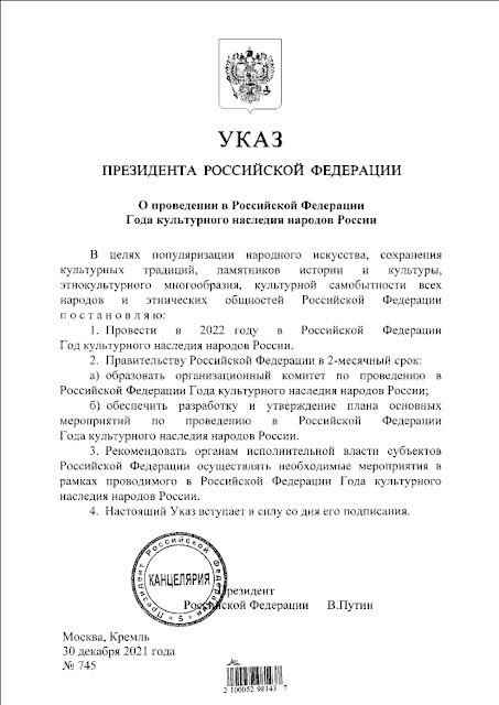 30 декабря 2021 года Президент Российской Федерации Владимир Путин подписал Указ об установлении в 2022 году Года культурного наследия народов России (Указ № 745 от 30.12.2021). Согласно документу, Год культурного наследия народов России проводится "в целях популяризации народного искусства, сохранения культурных традиций, памятников истории и культуры, этнокультурного многообразия, культурной самобытности всех народов и этнических общностей РФ".