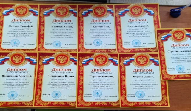 30 марта прошла защита индивидуальных проектов группы АТ-181. Все проекты были интересны, несли познавательную информацию, способствовали развитию коммуникативной культуры учащихся, развивали творческую активность, включали в себя вопросы, связанные со знаниями имен великих математиков, с историей математики, с шуточными заданиями на логику и интуицию, с практическими задачами, имеющими связь с другими предметами. Лучшими проектами признаны проекты: Чернышева Вадима, Глушак Максима, Чернова Данила, Наумова Тимофея, Сорокина Александра, Великанова Арсения, Акулова Андрея, Власюк Яны, Сергеева Антона.