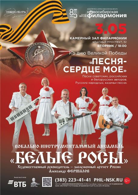 3 мая в 18:00 в Камерном зале состоится концерт «Песня – сердце мое», где Вокально-инструментальный ансамбль «Белые Росы» исполнит песни советских, российских, белорусских авторов, русские народные и казачьи песни.