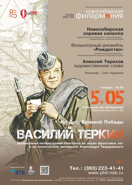 5 мая в 19:00 в Камерном зале Новосибирская хоровая капелла и Фольклорный ансамбль «Рождество» исполнит для вас музыкально-литературную композицию Василий Теркин, а также проведут урок мужества