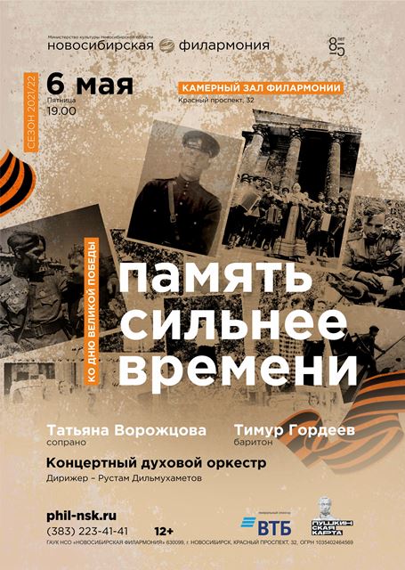 6 мая в 19:00 в Камерном зале Концертный духовой оркестр подарит концерт Память сильнее времени, где исполнит музыку Блантера, Баснера, Александрова, Лепина, Богословского, братьев Покрасс, Френкеля, Фрадкина, Молчанова, Лученока, Мартынова, Тухманова.