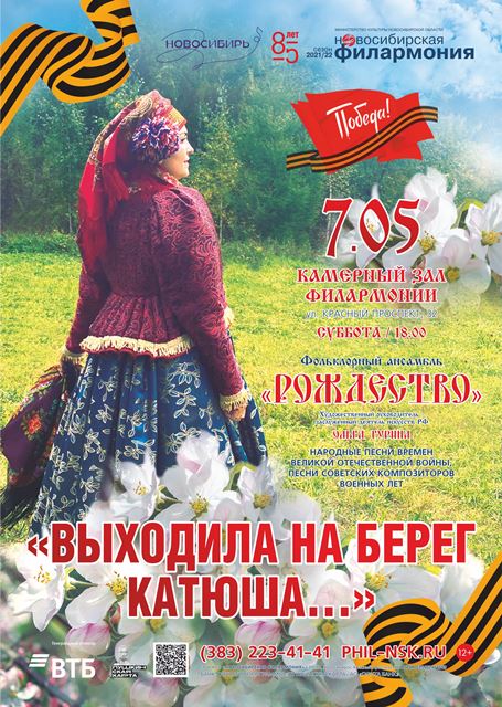 7 мая в 18:00 в Камерном зале Фольклорный ансамбль «Рождество» выступит с программой «Выходила на берег Катюша» с народными песнями времен Великой Отечественной войны и советских композиторов военных лет.