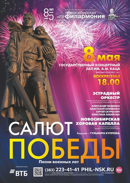 8 мая в 18:00 в Концертном зале имени А. Каца прозвучит концерт Салют Победы в исполнении Эстрадного оркестра и Новосибирской хоровой капеллы. В программе лучшие песни Арутюнова, Молчанова, Богословского, Петрова, Френкеля, Мартынова, Агапкина, Тухманова, Соловьева-Седого, Блантера, Дунаевского, Газманова.