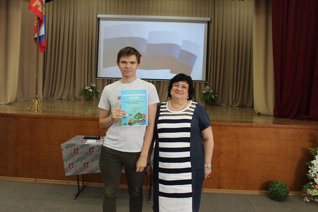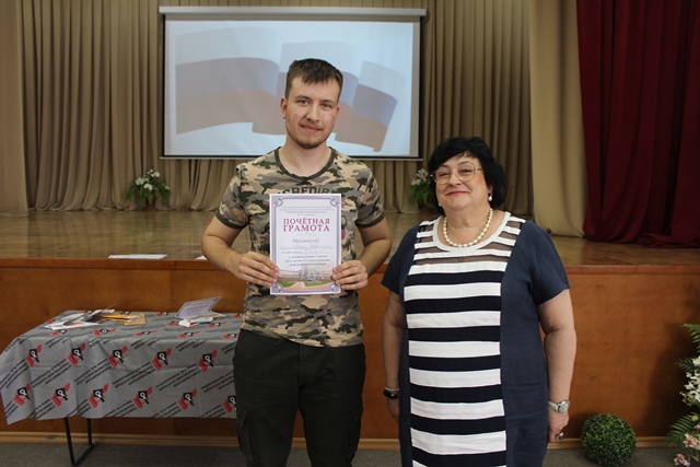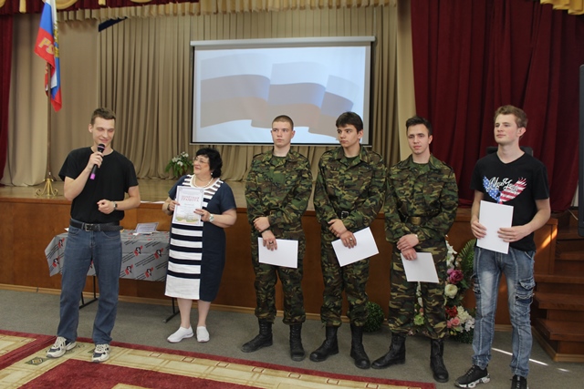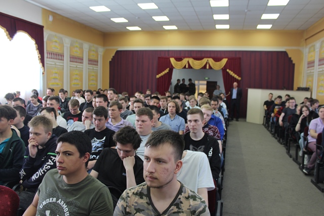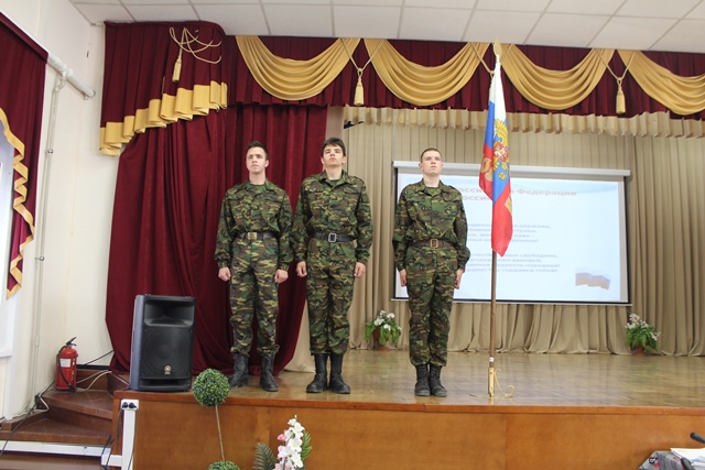 Перед началом мероприятия, к студентам обратилась заместитель директора по учебно-воспитательной работе Степанова Елена Владимировна, она поздравила ребят с возрождением традиции - все мероприятия колледжа начинать с выноса Государственного флага Российской Федерации и исполнения Государственного гимна нашей страны. Теперь еженедельные линейки в колледже будут начинаться с выноса флага. Почетное право сегодня вынести Государственный флаг Российской Федерации было предоставлено студентам 1 курса, членам студенческого Совета: Лапенко Андрею, Мовчану Александру, Калиниченко Кириллу. Под звуки торжественного марша знаменосцы внесли Государственный флаг Российской Федерации в зал и установили на сцене, после чего, вместе с фонограммой ансамбля им. Александрова студенты исполнили гимн Российской Федерации. Директор колледжа Галина Федоровна Талюкина в своем обращении к студентам отметила, что российский флаг олицетворяет силу, мощь и национальное достоинство нашей страны, связь эпох и преемственность поколений, верность народа историческим традициям, неразрывную связь прошлого, настоящего и будущего, символизирует свободу и независимость России. В конце мероприятия Галина Федоровна вручила грамоты и дипломы студентам, принявшим активное участие: в научно-практической конференции, посвященной Герману Титову; в акции «Трудовой десант» у Монумента Славы; в конкурсе буклетов, посвященном 77-й годовщине Победы в Великой Отечественной войне; в спектакле «Василий Теркин».