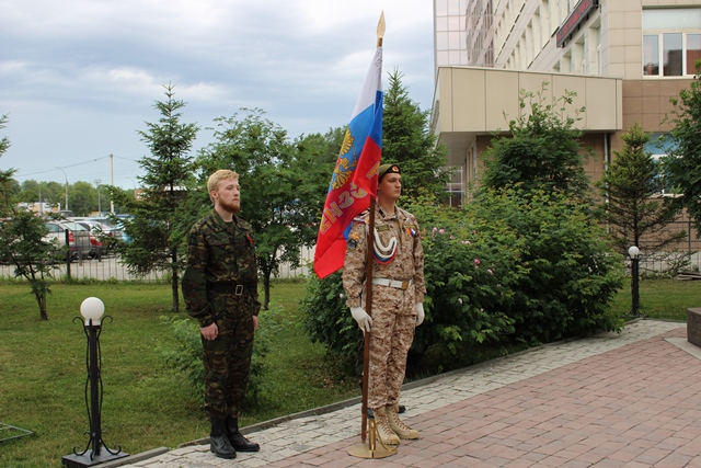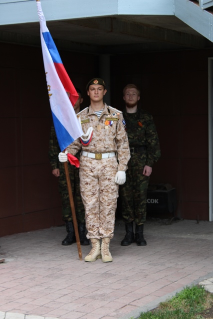 Почетное право внести Государственный флаг Российской Федерации было предоставляется студентам группы СВ 114: Мамышеву Никите, Бекирову Нариману, Миронову Георгию. На флаг во время митинга была надета траурная ленточка как знак скорби.