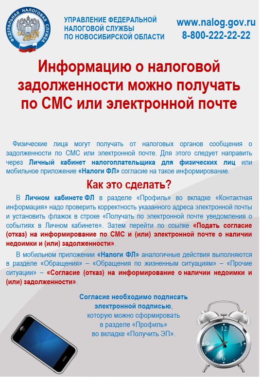Кроме того, новосибирцам может быть предоставлена услуга оперативного информирования о налоговой задолженности с помощью СМС или электронной почты.