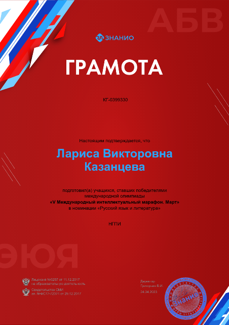 Студенты групп: М-151, С-111, Э-121, РП-261 приняли участие в «Международном интеллектуальном марафоне» по русскому языку и литературе, проверили и закрепили навыки, знания и умения по изученным темам. Все участники получили Свидетельство, а победители - Дипломы. Дипломами победителя награждены: Ефанов Илья (С-111), Калинин Матвей (С-111), Коваленко Никита (С-111),Лапин Даниил (С-111), Розанов Руслан (С-111),Дмитриенко Валентин (Э-121), Алябьев Илья (РП-261),Дмитриев Максим (РП-261), Пархачёв Максим (РП-261).
