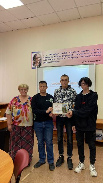 Для студентов 2 курса преподавателем русского языка и литературы Казанцевой Л.В. была проведена интеллектуальная викторина «Словесный ринг». Викторина позволила ввести студентов в сложный и увлекательный мир русской речи, показать слово как бы изнутри, вскрыть таящиеся в нём возможности, способствовала развитию мотивации к обучению русскому языку и литературе. Ребятам были предложены самые разные конкурсные задания: «Найди ошибку», «Книжный бум», «В мире слов», «Они тоже были маленькими», «Глаза-зеркало души», «Кружит голову», «Пантомимы!», «Путаница». В викторине принимали участие команды групп ЭГ-21, РП-261, ТГ-291, К-241, М-251.Оценивало выполнение заданий жюри, в которое входили Тинина Алиса Олеговна - заведующая учебной частью и Симакова Ангелина Олеговна- заведующая учебной частью. Команды активно боролись за призовые места, которые распределились следующим образом: