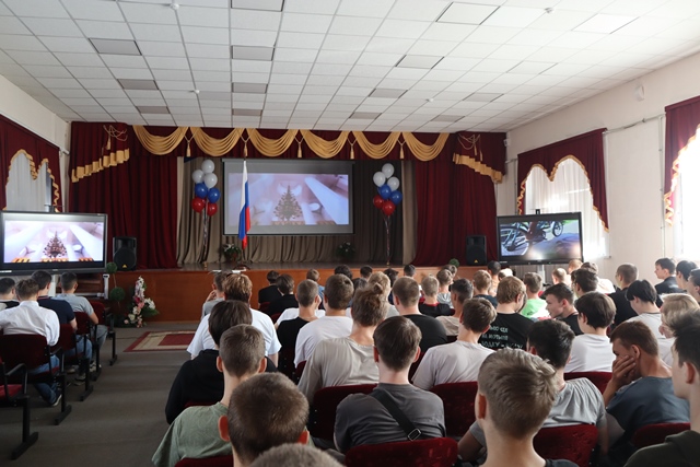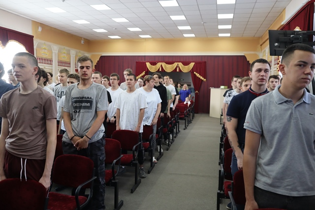 Прозвучал гимн Российской Федерации. Знаменной группой в составе студентов группы СВ 214: Мелентьева Ивана, Бекирова Наримана, Миронова Георгия был внесен Государственный Флаг Российской Федерации.