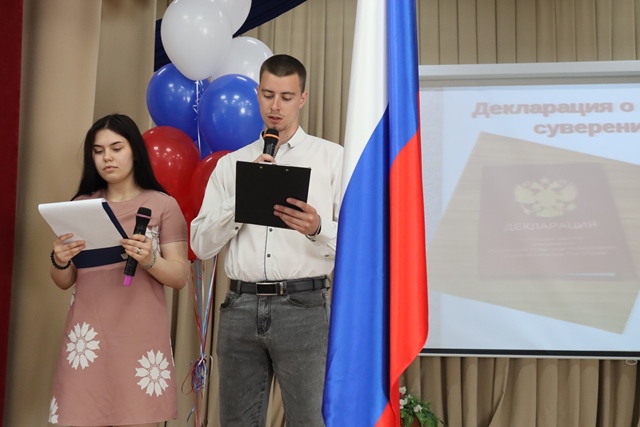 Об истории возникновения и традициях, принятых в нашей стране в этот день, собравшимся в зале рассказали студенты: Чепурной Роман и Кожевникова Ксения: «День России - один из самых молодых государственных праздников. Сначала он назывался Днем принятия декларации о государственном суверенитете России и только с 2002 года обрел свое нынешнее название. Отмечают День России 12 июня, в 2023 году он приходится на поендельник. Именно 12 июня 1990 года I Съезд народных депутатов принял Декларацию о государственном суверенитете РСФСР, в которой провозглашалось равноправие политических партий и общественных организаций, был принят принцип разделения властей, определилось верховенство Конституции и законов РСФСР на всей ее территории. В 1995 году 12 июня прошли первые торжественные мероприятия. В 1998 году президент в телеобращении к россиянам предложил называть этот праздник Днем России, что и было официально сделано в 2002 году. С 1995 года в этот день в Кремле глава государства традиционно вручает государственные премии в области науки, технологий, литературы и искусства. С 2001 года было положено начало обязательным салютам, завершающим большой концерт на Красной площади. В этот день было принято новое название нашей страны - Российская Федерация (Россия), Декларация о государственном суверенитете дала отсчет истории государства, которое основано на гражданских свободах и верховенстве закона».