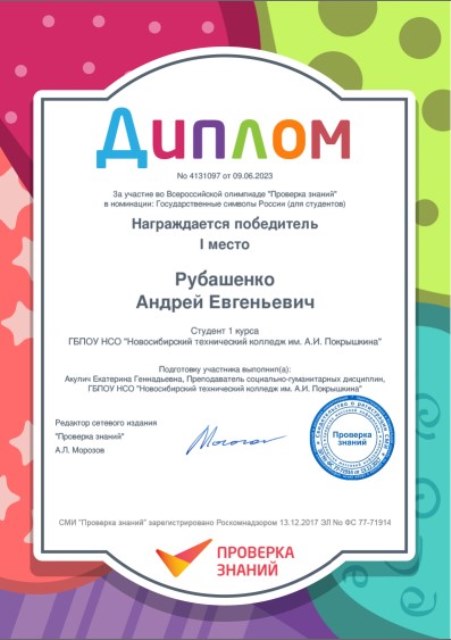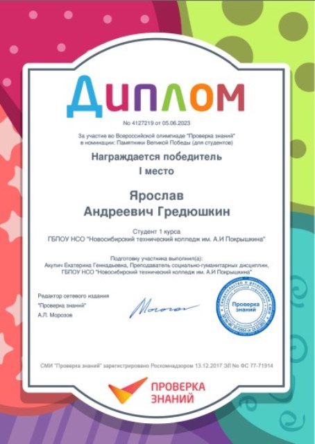 Ко Дню России студенты нашего колледжа Кузьменко Степан (группа 211), Поршнев Михаил, Линев Данил, Гредюшкин Ярослав, Грицишин Никита, Рубашенко Андрей (группа ТГ-191) под руководством преподавателя Акулич Екатерины Геннадьевны приняли участие во Всероссийской онлайн-олимпиаде «Подари знание» и стали победителями в номинациях «Государственные символы России», «Памятники Великой Победы». Ребята проявили свои творческие способности и показали отличные знания, ответив на сложные вопросы.