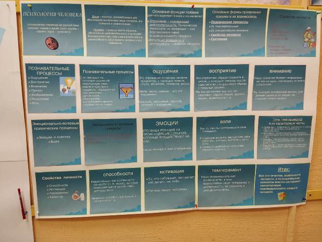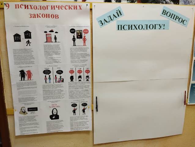 Возле актового зала оформлен психологический уголок. 9 основных законов психологии, лист «Задай вопрос психологу» и стенд «Психология как наука».