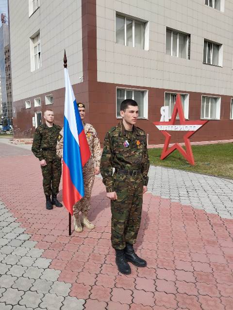 Грибков Владимир и Мелентьев Иван – представители «Знаменной группы» колледжа развернули перед собравшимися на митинге Флаг России с надписями воинов, который Ольга Андреевна Погребняк привезла с Донбасса, когда ездила туда в январе этого года к мужу.