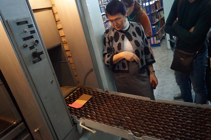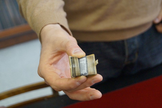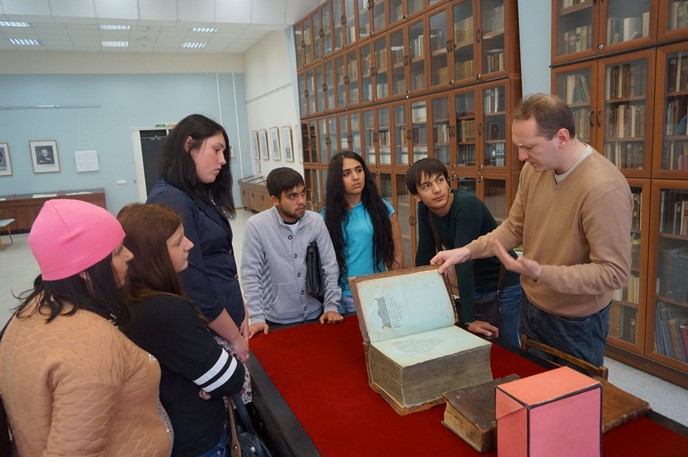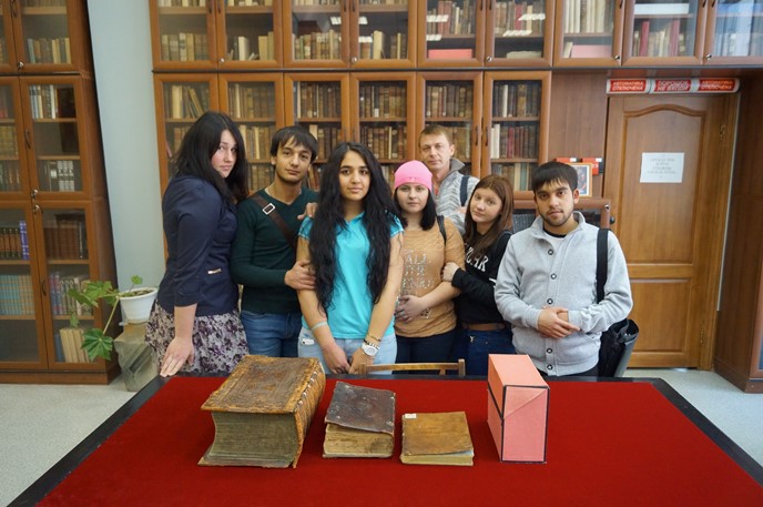 Но особенно ребятам понравился Отдел редких книг и рукописей, в котором сосредоточены свыше 20 тысяч раритетов, количество которых постоянно пополняется за счёт находок археографических экспедиций. Студентам показали книги XVII и XVIII веков, а также самые большие и самые миниатюрные книги, которые даже сложно было взять в руки.