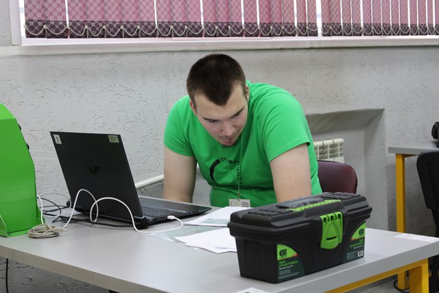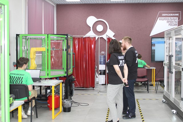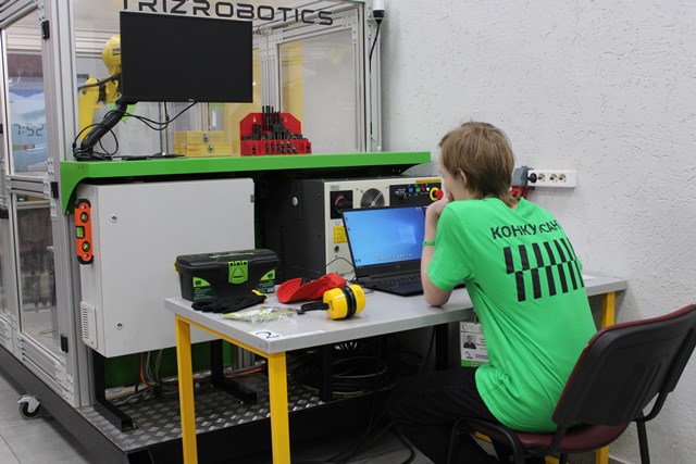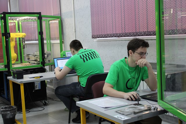 На площадке «Промышленная робототехника» соревнуется 5 команд. В течение 3 конкурсных дней конкурсантом предстоит программирование и пусконаладочные работы роботизированного промышленного комплекса. Задача конкурсантов – спроектировать комплект оборудования, произвести подключение электроприборов, запрограммировать алгоритм работы. В первый конкурсный день конкурсанты выполняют 5 модулей и производят его настройку.
